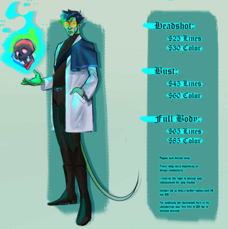 A: Talk to me! I have base prices listed for the types of commissions I typically do, but I'm always happy to do something different!